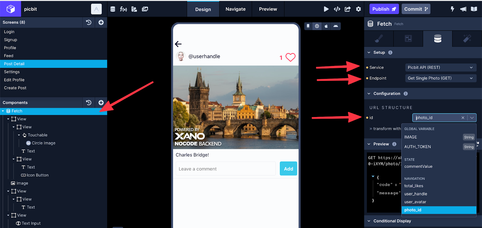 Now, let’s add an endpoint to fetch the details of a photo from the /photos database table in Xano. This endpoint requires the photo’s id to be passed as a query parameter. The id here is received as a navigation parameter from the Feed screen. This determines that the endpoint will fetch the photo’s details that a user pressed in the Feed screen.