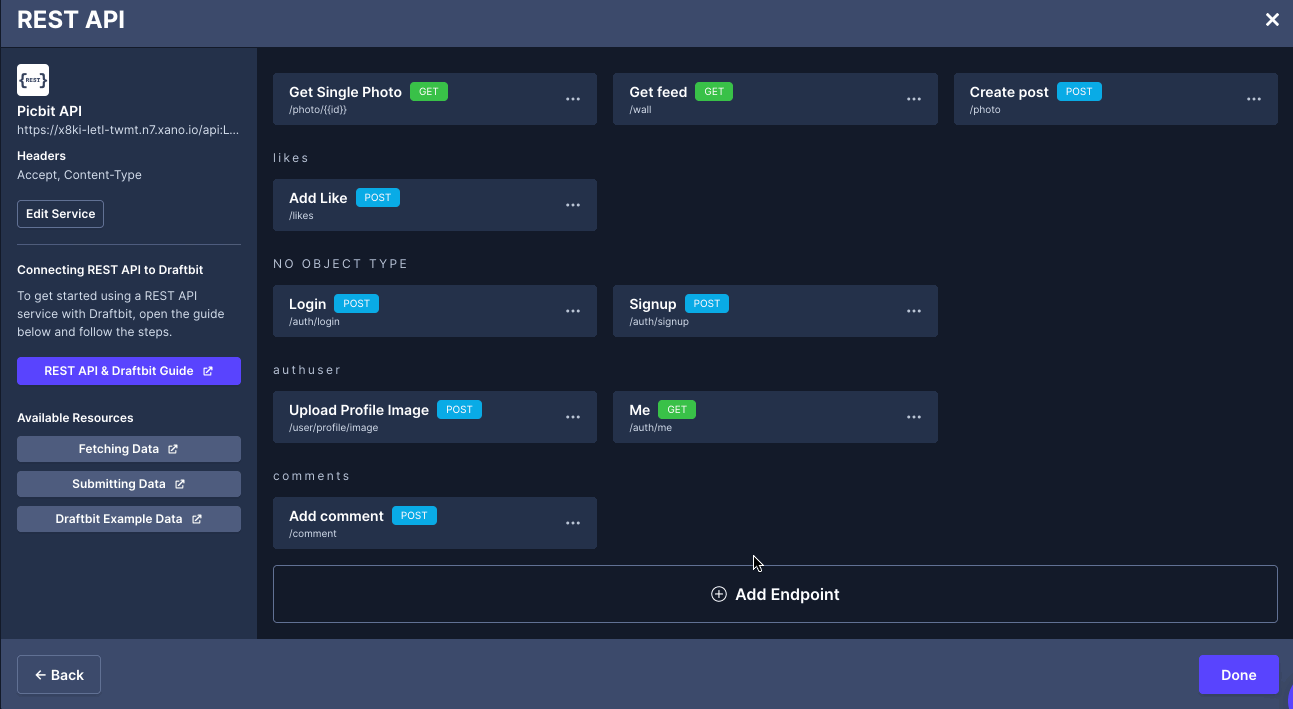 Start by adding the endpoint /likes in your Draftbit’s REST API service: