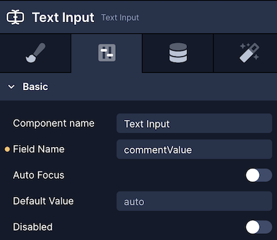 The value commentValue of the Field Name prop is set by selecting the TextInput component in the Components tree and then navigating to Configs (second tab) in the Properties panel.