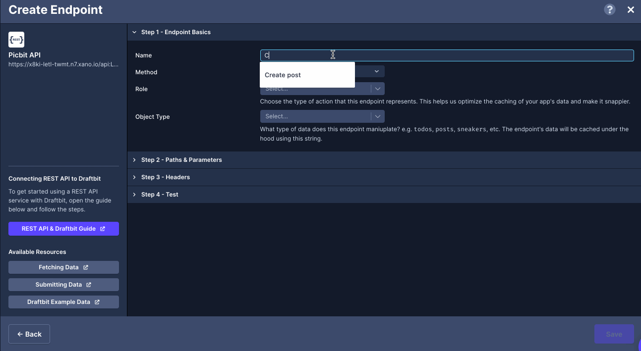 - In Step 1: add the endpoint’s name and set the Method to POST. Set the Role to Create since this endpoint is creating a new record in the database. Set the Object Type to comments.