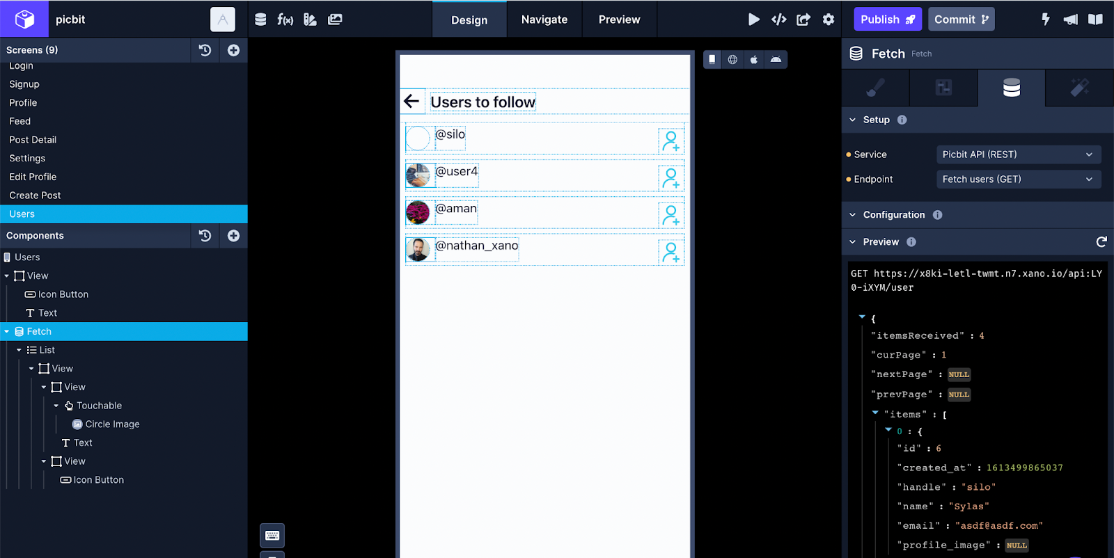 The Users screen will display the user’s avatar, their handle, and an Icon button to follow them. It uses a Fetch component to get the users list from the user database table and a List component to display the list of users.