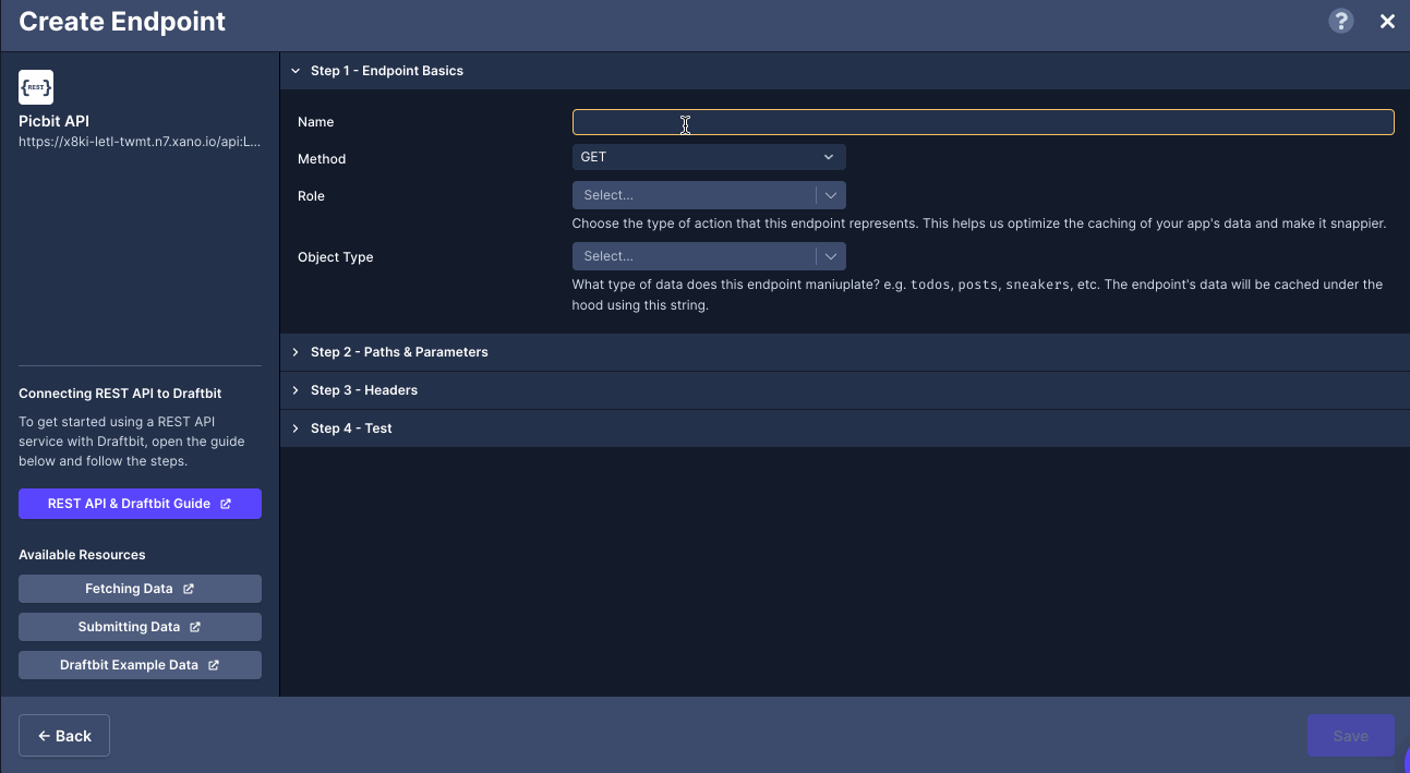 - In Step 1: add the endpoint’s name and set the Method to GET. Set the Role to Get One since this endpoint creates a new record in the database. Set the Object Type to photos.