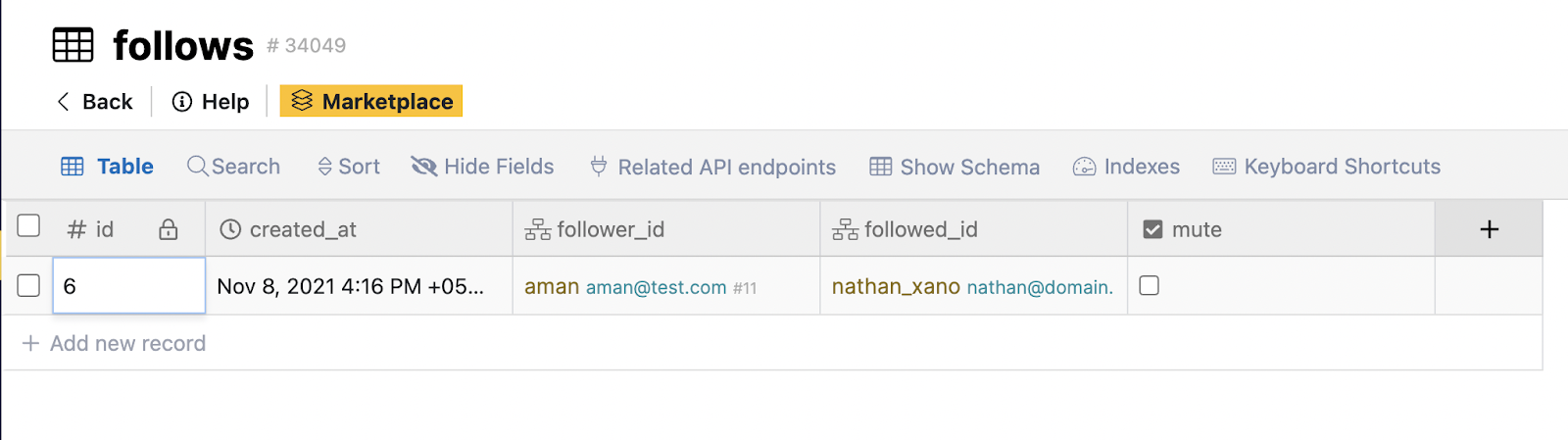 The follows database table in Xano also stores a record of the follower’s and followed user’s ids: