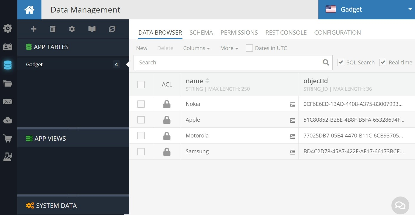 After the app configuration, you must have a custom datatable or configure one in Backendless. We are using a custom data table called Gadget with pre-populated custom data.