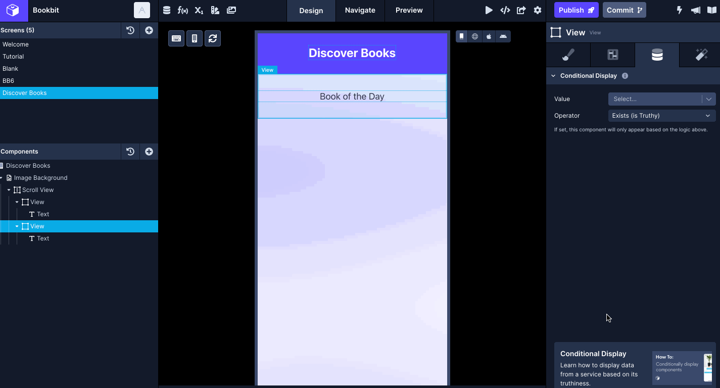 - Add a Text component to this View as a child. In the Styles tab, modify its Font to 18, and Align to center. Also, add a margin-bottom of 18. Then, add the text Book of the Day in the Data tab.