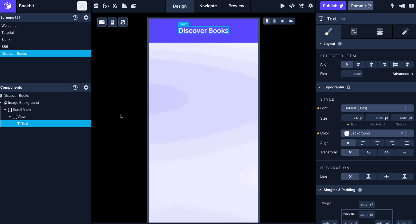- Set the styles for the Text in the Styles tab. The Font will have the value of the 24 and the Color of the value Background. In the Configs tab, add the value for the Text component to Discover Books.